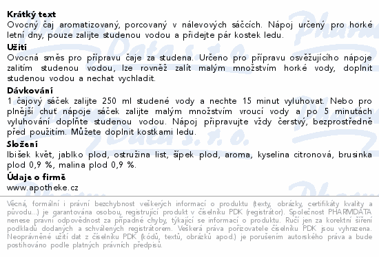 Ovocný čaj aromatizovaný, porcovaný v nálevových sáčcích. Nápoj určený pro horké letní dny, pouze zalijte studenou vodou a přidejte pár kostek ledu.