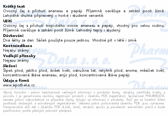 Ovocný čaj s příchutí ananasu a papáji. Příjemně osvěžuje a zahání pocit žízně. Lahodně chutná připravený v horké i studené variantě.