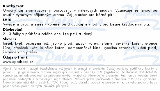 Ovocný čaj aromatizovaný, porcovaný v nálevových sáčcích. Vyznačuje se lahodnou chutí a výrazným příjemným aroma. Čaj je určen pro běžné pití.