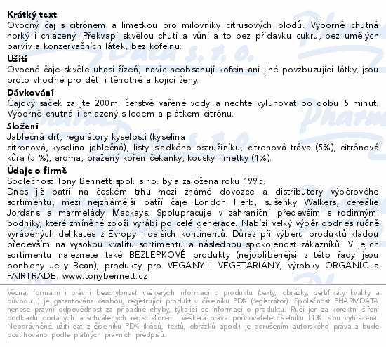Ovocný čaj s citrónem a limetkou pro milovníky citrusových plodů. Výborně chutná horký i chlazený. Překvapí skvělou chutí a vůní a to bez přídavku cukru, bez umělých barviv a konzervačních látek, bez kofeinu.