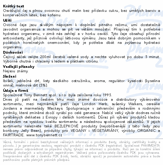 Osvěžující čaj s plnou ovocnou chutí malin bez přídavku cukru, bez umělých barviv a konzervačních látek, bez kofeinu.