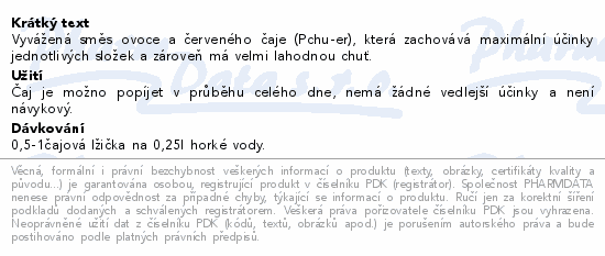 Vyvážená směs ovoce a červeného čaje (Pchu-er), která zachovává maximální účinky jednotlivých složek a zároveň má velmi lahodnou chuť.