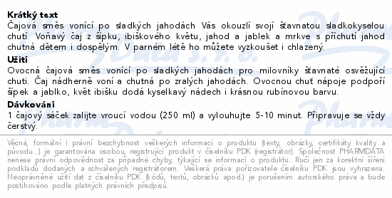 Čajová směs vonící po sladkých jahodách Vás okouzlí svojí šťavnatou sladkokyselou chutí. Voňavý čaj z šípku, ibiškového květu, jahod a jablek a mrkve s příchutí jahod chutná dětem i dospělým. V parném létě ho můžete vyzkoušet i chlazený.