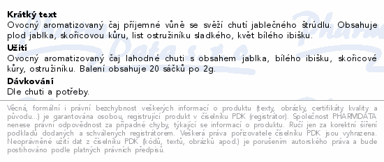 Ovocný aromatizovaný čaj příjemné vůně se svěží chutí jablečného štrúdlu. Obsahuje plod jablka, skořicovou kůru, list ostružiníku sladkého, květ bílého ibišku.
