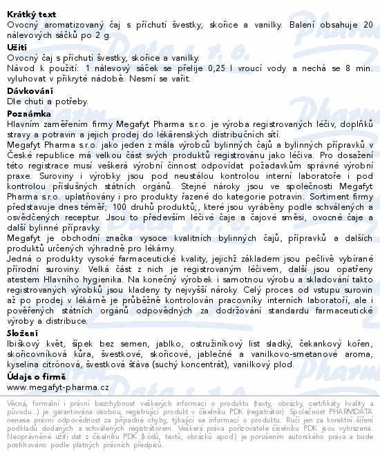 Ovocný aromatizovaný čaj s příchutí švestky, skořice a vanilky. Balení obsahuje 20 nálevových sáčků po 2 g.