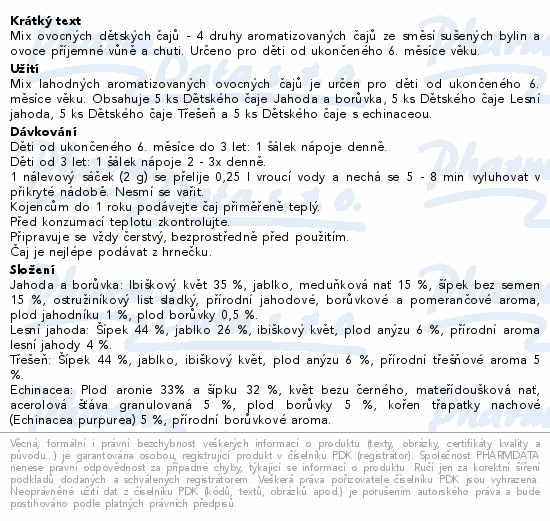 Mix ovocných dětských čajů - 4 druhy aromatizovaných čajů ze směsí sušených bylin a ovoce příjemné vůně a chuti. Určeno pro děti od ukončeného 6. měsíce věku.