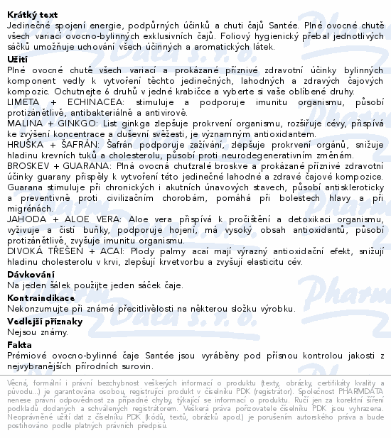 Jedinečné spojení energie, podpůrných účinků a chuti čajů Santée. Plné ovocné chutě všech variací ovocno-bylinných exklusivních čajů. Foliový hygienický přebal jednotlivých sáčků umožňuje uchování všech účinných a aromatických látek.