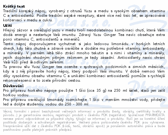 Tradiční korejský nápoj, vyrobený z citrusů Yuzu a medu s vysokým obsahem vitaminu C a antioxidantů. Podle tradiční asijské receptury, staré více než tisíc let, se zpracovává konzervací v medu a cukru.