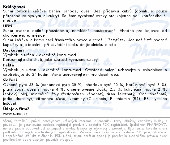 Sunar ovocná kašička banán, jahoda, oves. Bez přídavku cukrů (obsahuje pouze přirozeně se vyskytující cukry). Součást vyvážené stravy pro kojence od ukončeného 6. měsíce.