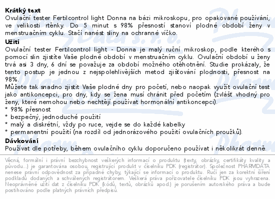 Ovulační tester Fertilcontrol light Donna na bázi mikroskopu, pro opakované používání, ve velikosti rtěnky. Do 5 minut s 98% přesností stanoví plodné období ženy v menstruačním cyklu. Stačí nanést sliny na ochranné víčko.