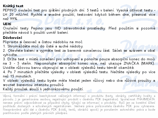 PEPINO ovulační test pro zjištění plodných dní. 5 testů v balení. Vysoká citlivost testu - LH 20 mlU/ml. Rychlé a snadné použití, testování kdykoli během dne, přesnost více než 99%.