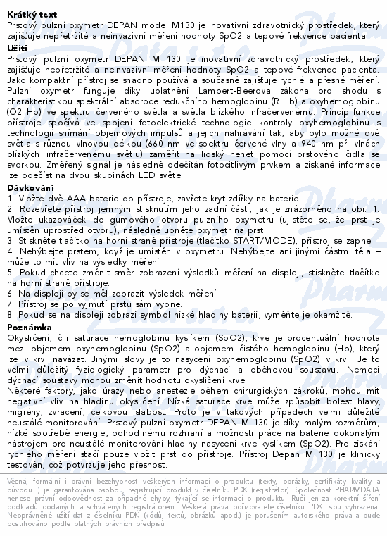 Prstový pulzní oxymetr DEPAN model M130 je inovativní zdravotnický prostředek, který zajišťuje nepřetržité a neinvazivní měření hodnoty SpO2 a tepové frekvence pacienta.