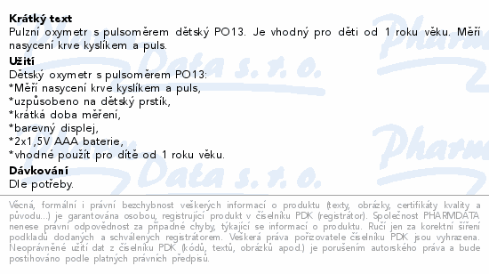 Pulzní oxymetr s pulsoměrem dětský PO13. Je vhodný pro děti od 1 roku věku. Měří nasycení krve kyslíkem a puls.