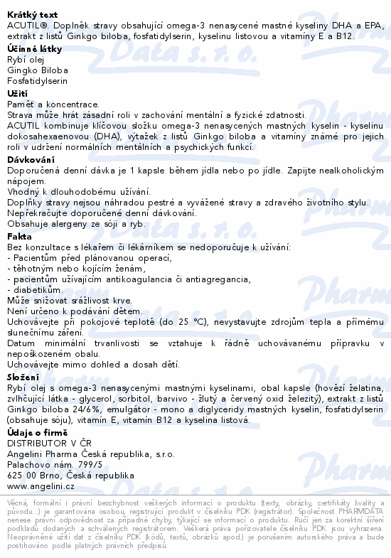 ACUTIL®. Doplněk stravy obsahující omega-3 nenasycené mastné kyseliny DHA a EPA, extrakt z listů Ginkgo biloba, fosfatidylserin, kyselinu listovou a vitamíny E a B12.