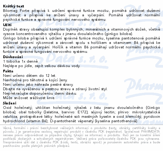 Bilomag Forte přispívá k udržení správné funkce mozku, pomáhá udržovat duševní výkonnost a přispívá ke snížení únavy a vyčerpání. Pomáhá udržovat normální psychické funkce a správné fungování nervového systému.
