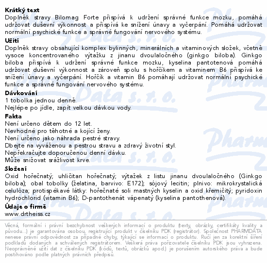 Doplněk stravy Bilomag Forte přispívá k udržení správné funkce mozku, pomáhá udržovat duševní výkonnost a přispívá ke snížení únavy a vyčerpání. Pomáhá udržovat normální psychické funkce a správné fungování nervového systému.