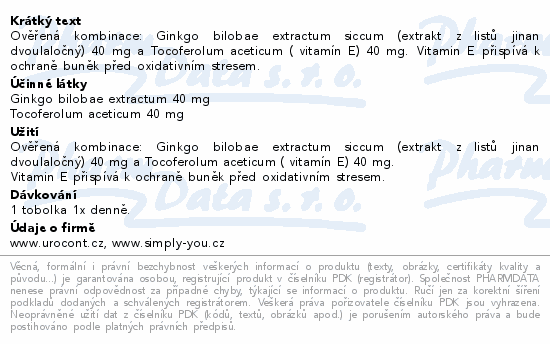 Ověřená kombinace: Ginkgo bilobae extractum siccum (extrakt z listů jinan dvoulaločný) 40 mg a Tocoferolum aceticum ( vitamín E) 40 mg. Vitamin E přispívá k ochraně buněk před oxidativním stresem.