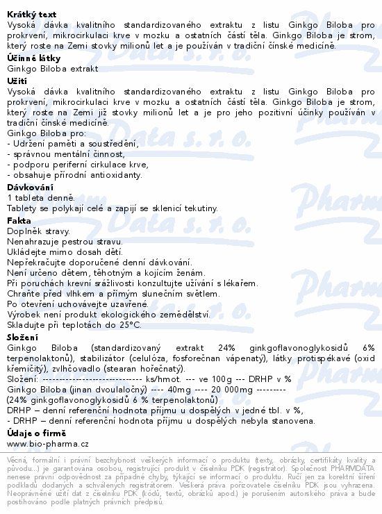 Vysoká dávka kvalitního standardizovaného extraktu z listu Ginkgo Biloba pro prokrvení, mikrocirkulaci krve v mozku a ostatních částí těla. Ginkgo Biloba je strom, který roste na Zemi stovky milionů let a je používán v tradiční čínské medicíně.