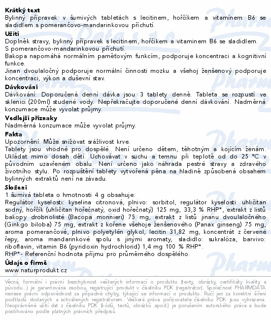 Bylinný přípravek v šumivých tabletách s lecitinem, hořčíkem a vitamínem B6 se sladidlem s pomerančovo-mandarinkovou příchutí.
