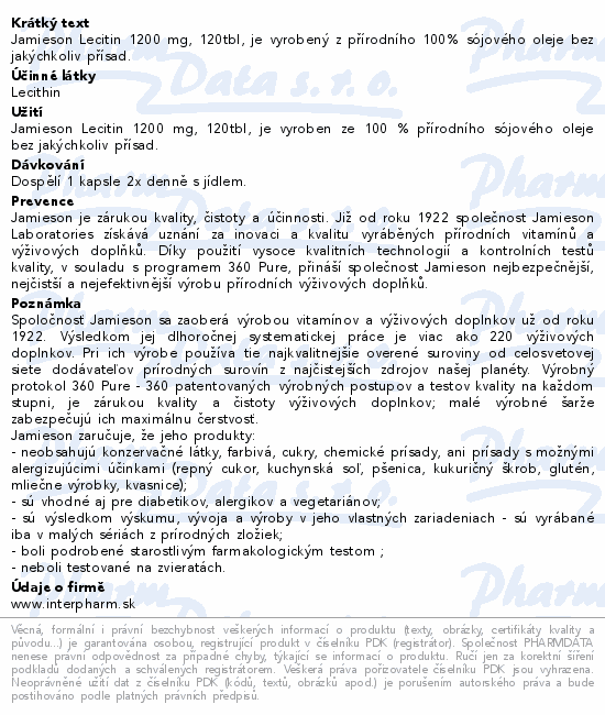 Jamieson Lecitin 1200 mg, 120tbl, je vyrobený z přírodního 100% sójového oleje bez jakýchkoliv přísad.