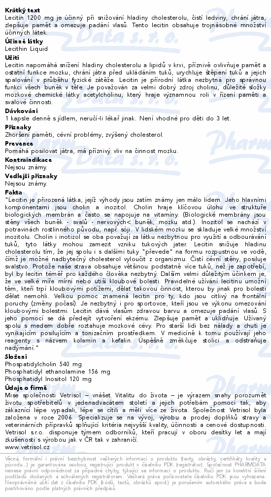 Lecitin 1200 mg je účinný při snižování hladiny cholesterolu, čistí ledviny, chrání játra, zlepšuje paměť a omezuje padání vlasů. Tento lecitin obsahuje trojnásobné množství účinných látek.