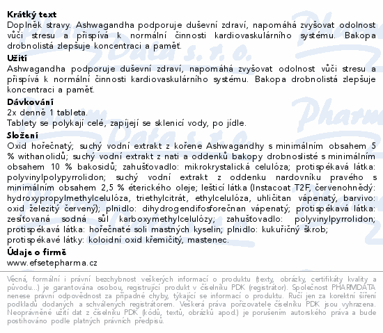 Doplněk stravy. Ashwagandha podporuje duševní zdraví, napomáhá zvyšovat odolnost vůči stresu a přispívá k normální činnosti kardiovaskulárního systému. Bakopa drobnolistá zlepšuje koncentraci a paměť.