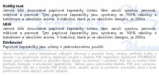Jemné bílé dvouvrstvé papírové kapesníky Linteo Vám zaručí vysokou jemnost, měkkost a pevnost. Tyto papírové kapesníčky jsou vyrobeny ze 100% celulózy s balzámem a vánočním aroma. V krabičce, která je ve vánočním designu, je 200ks.