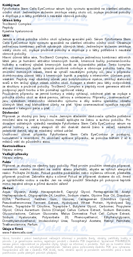 Fytofontana Stem Cells EyeContour sérum bylo vyvinuto speciálně na ošetření citlivého očního okolí. Jedinečným složením zmírňuje vrásky okolo očí, zvyšuje pružnost pokožky a doplňuje ji o látky potřebné k neustálé obnově pokožky.