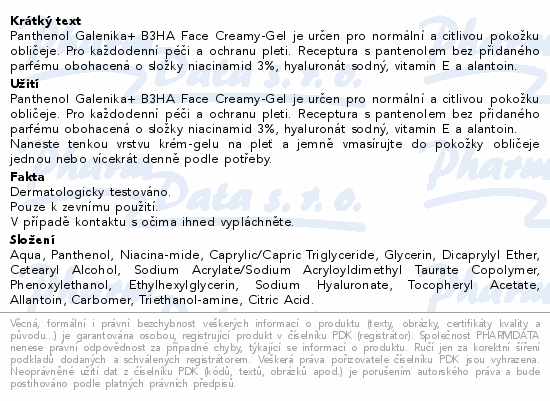 Panthenol Galenika+ B3HA Face Creamy-Gel je určen pro normální a citlivou pokožku obličeje. Pro každodenní péči a ochranu pleti. Receptura s pantenolem bez přidaného parfému obohacená o složky niacinamid 3%, hyaluronát sodný, vitamin E a alantoin.