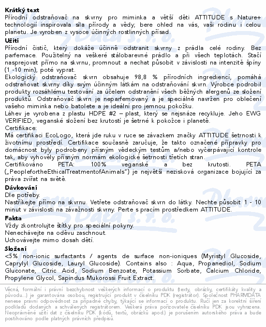 Přírodní odstraňovač na skvrny pro miminka a větší děti ATTITUDE s Nature+ technologií inspirovala síla přírody a vědy; bere ohled na vás, vaši rodinu i celou planetu. Je vyroben z vysoce účinných rostlinných přísad.