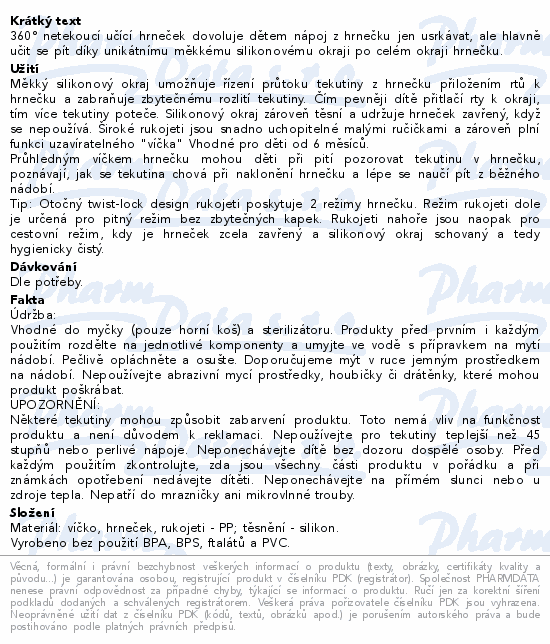 360° netekoucí učící hrneček dovoluje dětem nápoj z hrnečku jen usrkávat, ale hlavně učit se pít díky unikátnímu měkkému silikonovému okraji po celém okraji hrnečku.