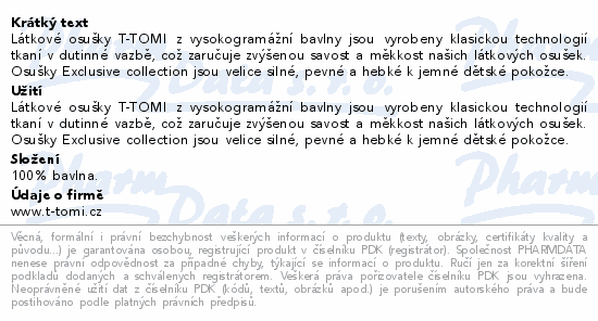 Látkové osušky T-TOMI z vysokogramážní bavlny jsou vyrobeny klasickou technologií tkaní v dutinné vazbě, což zaručuje zvýšenou savost a měkkost našich látkových osušek. Osušky Exclusive collection jsou velice silné, pevné a hebké k jemné dětské pokožce.