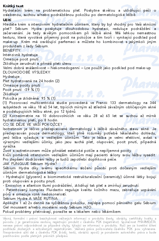 Sébium Hydra je hydratační krém na komplementární péči pro anti-aknózní léčbu, která vede k vysušování kůže a lokálním podrážděním. Poskytuje dlouhotrvající zvlhčení díky rezervoárnímu účinku. Kompenzuje slupování a napětí v ošetřované kůži.