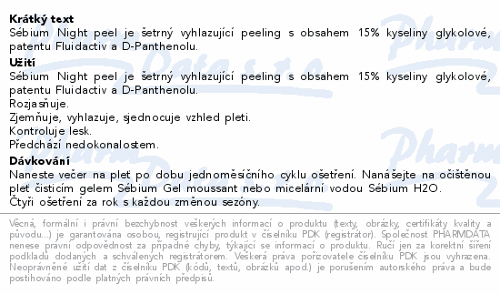 Sébium Night peel je šetrný vyhlazující peeling s obsahem 15% kyseliny glykolové, patentu Fluidactiv a D-Panthenolu.