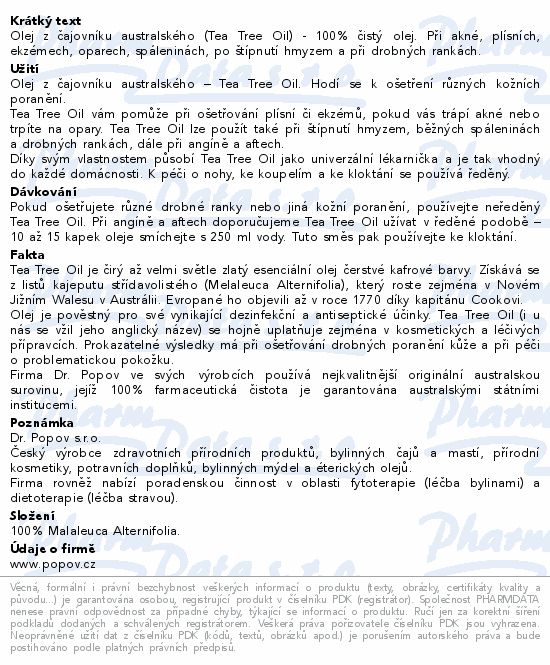 Tea Tree Oil Dr. Popov je čistý, 100% přírodní esenciální olej z čajovníku australského, známý svými antiseptickými a osvěžujícími účinky. Je vhodný k vnějšímu použití při drobných kožních problémech, jako jsou pupínky, akné, bodnutí hmyzem, odřeniny nebo podráždění kůže.