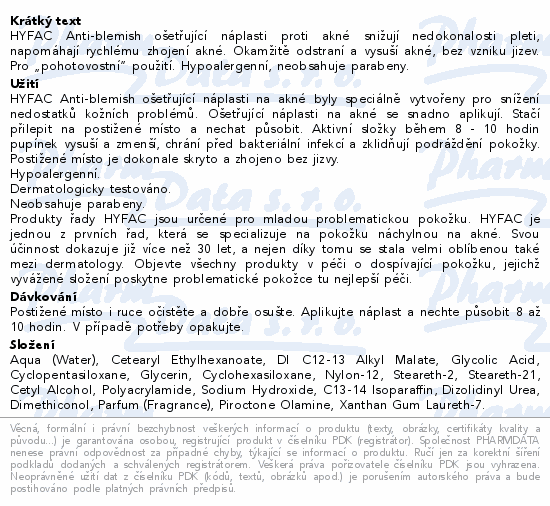 HYFAC Anti-blemish ošetřující náplasti proti akné snižují nedokonalosti pleti, napomáhají rychlému zhojení akné. Okamžitě odstraní a vysuší akné, bez vzniku jizev. Pro „pohotovostní“ použití. Hypoalergenní, neobsahuje parabeny.