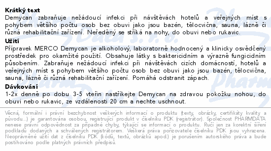 Demycan zabraňuje nežádoucí infekci při návštěvách hotelů a veřejných míst s pohybem většího počtu osob bez obuvi jako jsou bazén, tělocvična, sauna, lázně či různá rehabilitační zařízení. Neředěný se stříká na nohy, do obuvi nebo rukavic.