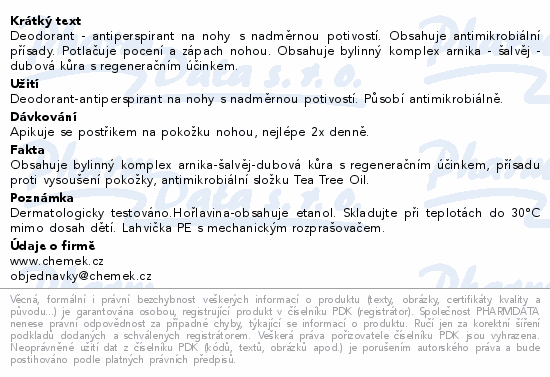Deodorant - antiperspirant na nohy s nadměrnou potivostí. Obsahuje antimikrobiální přísady. Potlačuje pocení a zápach nohou. Obsahuje bylinný komplex arnika - šalvěj - dubová kůra s regeneračním účinkem.