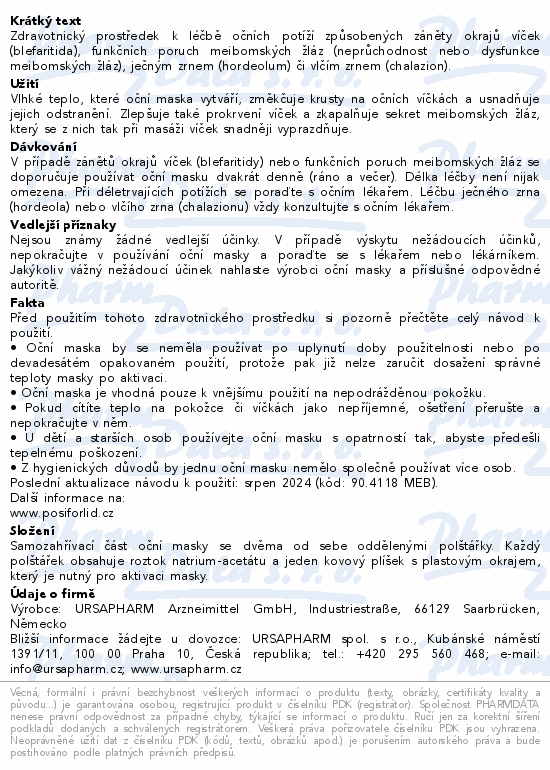 Zdravotnický prostředek k léčbě očních potíží způsobených záněty okrajů víček (blefaritida), funkčních poruch meibomských žláz (neprůchodnost nebo dysfunkce meibomských žláz), ječným zrnem (hordeolum) či vlčím zrnem (chalazion).