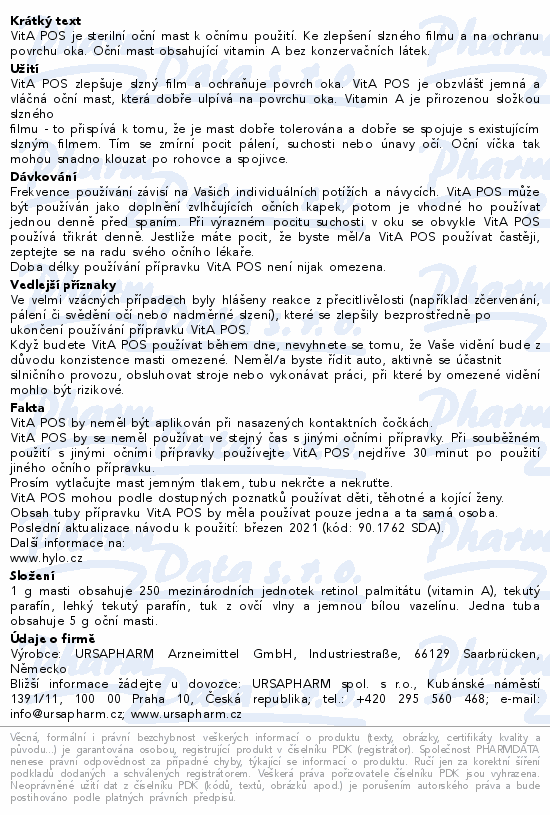 VitA POS® je sterilní oční mast k očnímu použití. Ke zlepšení slzného filmu a na ochranu povrchu oka. Oční mast obsahující vitamin A bez konzervačních látek.