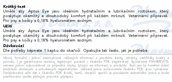 Umělé slzy Aptus Eye jsou ideálním hydratačním a lubrikačním roztokem, který poskytuje okamžitý a dlouhodobý komfort při každém mrknutí. Veterinární přípravek. Pro psy a kočky s 0,18% hyaluronátem sodným.