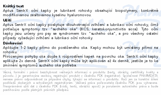Aptus SentrX oční kapky je lubrikant rohovky obsahující biopolymery, konkrétně modifikovanou zesíťovanou kyselinu hyaluronovou.