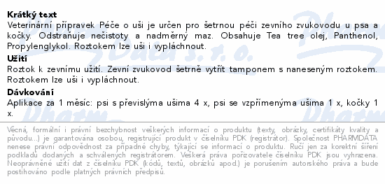 Veterinární přípravek Péče o uši je určen pro šetrnou péči zevního zvukovodu u psa a kočky. Odstraňuje nečistoty a nadměrný maz. Obsahuje Tea tree olej, Panthenol, Propylenglykol. Roztokem lze uši i vypláchnout.