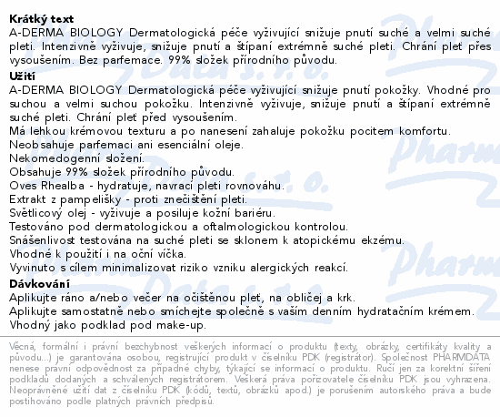 A-DERMA BIOLOGY Dermatologická péče vyživující snižuje pnutí suché a velmi suché pleti. Intenzivně vyživuje, snižuje pnutí a štípaní extrémně suché pleti. Chrání pleť přes vysoušením. Bez parfemace. 99% složek přírodního původu.