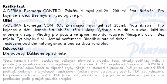 A-DERMA Exomega CONTROL Zvláčňující mycí gel 2v1 200 ml. Proti škrábání. Pro kojence a děti. Bez mýdla. Fyziologické pH.