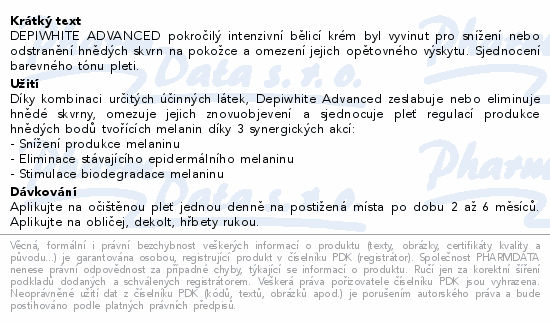 DEPIWHITE ADVANCED pokročilý intenzivní bělicí krém byl vyvinut pro snížení nebo odstranění hnědých skvrn na pokožce a omezení jejich opětovného výskytu. Sjednocení barevného tónu pleti.