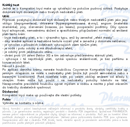 Jedná se o Kompaktní krycí make up vytvářející na pokožce pudrový vzhled. Poskytuje dokonalé krytí dočasných nebo trvalých nedostatků pleti.