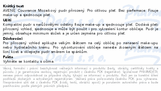 AVENE Couvrance Mozaikový pudr přirozený. Pro citlivou pleť. Bez parfemace. Fixuje make-up a sjednocuje pleť.