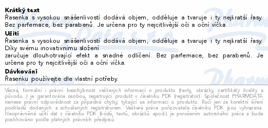 Řasenka s vysokou snášenlivostí dodává objem, odděluje a tvaruje i ty nejkratší řasy. Bez parfemace, bez parabenů. Je určena pro ty nejcitlivější oči a oční víčka.