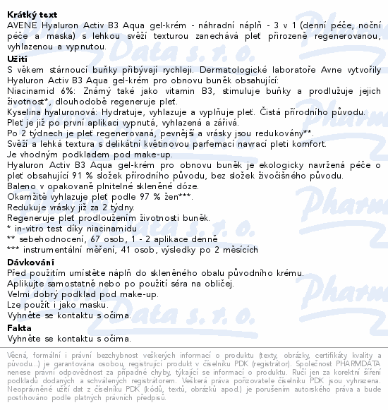 AVENE Hyaluron Activ B3 Aqua gel-krém - náhradní náplň - 3 v 1 (denní péče, noční péče a maska) s lehkou svěží texturou zanechává pleť přirozeně regenerovanou, vyhlazenou a vypnutou.